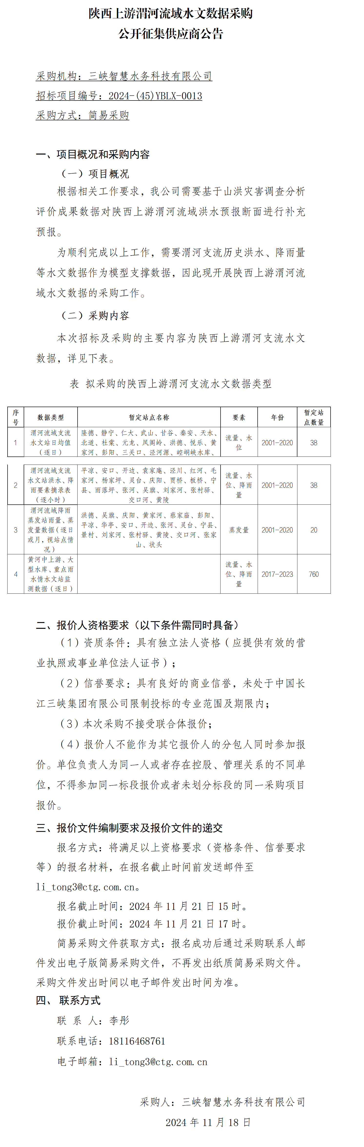 陕西上游渭河流域水文数据采购 公开征集供应商公告