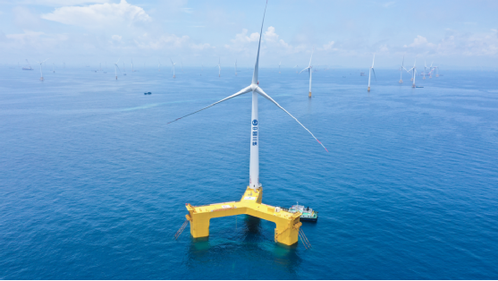 ▲全球首台抗台风型漂浮式海上风电机组——“三峡引领号”。