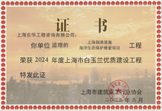 上海临港滨海海洋生态保护修复项目是上海首个大型海洋生态修复工程,施工过程中面临消浪坝建设、互花米草治理等滩面施工受潮汐风浪影响大、材料设备进场运输难度高、互花米草治理易复发等多重挑战。监理部创新采用首件制样板段先行、开展QC质量控制活动、组织标段之间经验交流等方式,推动施工与科研深度融合,形成了互花米草治理“刈割+深埋”、海三棱藨草种植、科普服务驿站3D打印、牡蛎礁半圆体精确定位安放、海底光缆综合保护等多项施工关键技术和工艺,参与编制国内首部海洋生态修复工程施工验评标准并投入使用,在后续同类项目中得到广泛推广。2025年9月,该项目荣获2024年度上海市白玉兰优质建设工程奖。