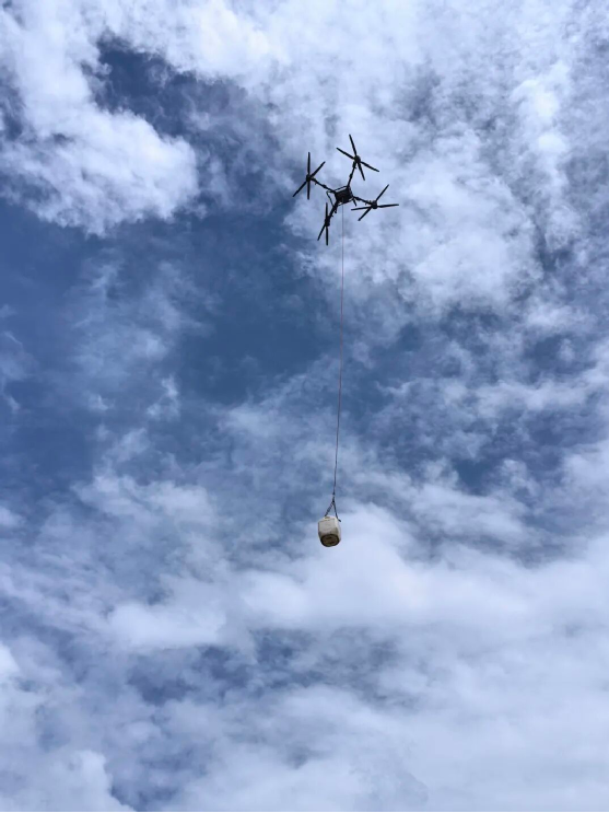 同时,无人机配备多冗余飞控系统、实时避障雷达及抗干扰通信模块,可在大风、复杂地形等恶劣环境下保持吊装姿态稳定;通过提前规划航线、坐标精准定位,并结合高清影像动态调整落点,实现设备投放“零失误”。这一技术应用不仅避免了临时道路开挖对生态环境的影响,更从根本上消除了野外作业人员搬迁设备时的坠落风险。