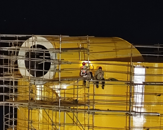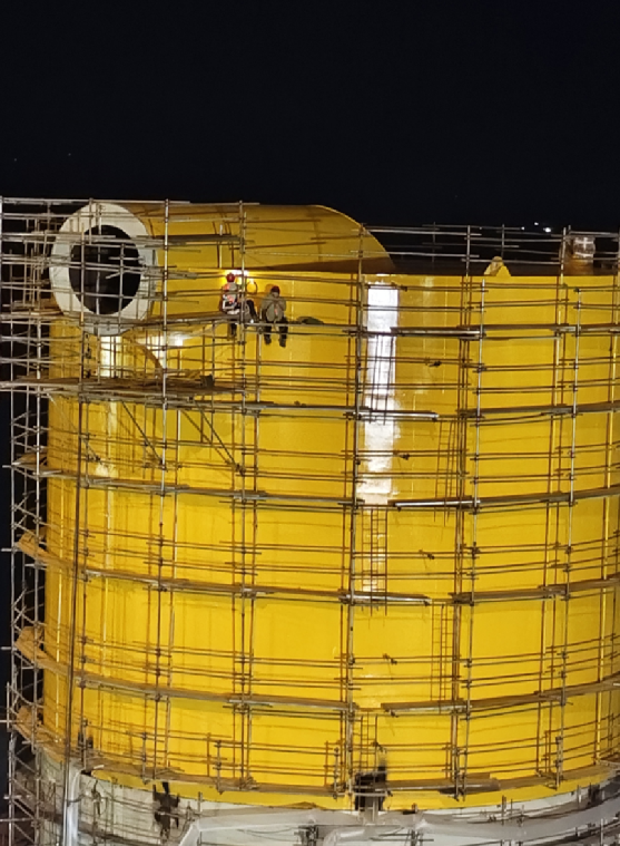 三峡阳江青洲七期10兆瓦级以上创新型漂浮式海上风电成套系统研发项目现场,漂浮式风机立柱泛着明亮的黄色光泽,宛如一轮明月,监测人员坚守一线在立柱上安装监测设备,为漂浮式风机装配和下水排除风险、保驾护航!