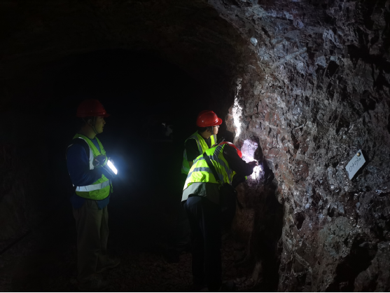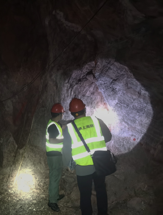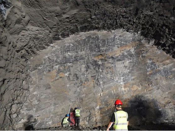 河北青龙冰沟抽水蓄能平硐地质编录现场,地质工程师丁斌、曹云通过手电打出来的“圆月”在洞室内开展地质编录,推断整体地质构造,为进一步设计施工提供地质建议。
