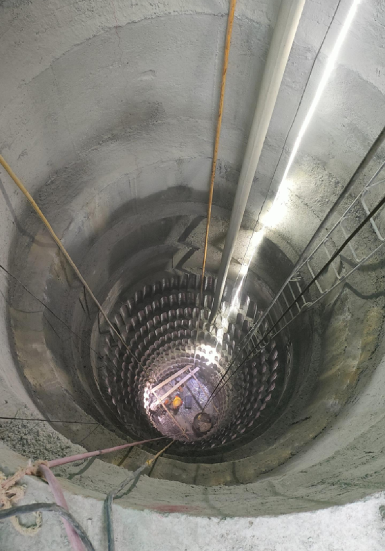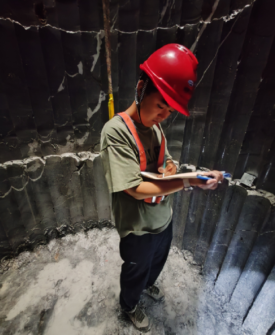 菜籽坝抽蓄项目现场,地质人员裴江涛进入桥墩的人工挖孔桩中开展地质编录工作,用纸笔记录亿万年的岩层信息,为大桥的施工设计提供地质资料。