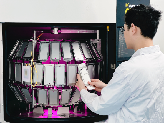 紫红色灯光和试样围成的球体组成了满满科技感的“赛博满月”,氙弧灯老化试验通过模拟全光谱太阳辐射,真实再现日光中的光、热、水、氧等多因子协同老化环境。设备可精确控制白昼与黑夜交替、晴天与雨天循环,综合引发材料的光降解、热老化、水解及氧化反应,广泛应用于材料的耐候性测试、性能筛选与配方优化。