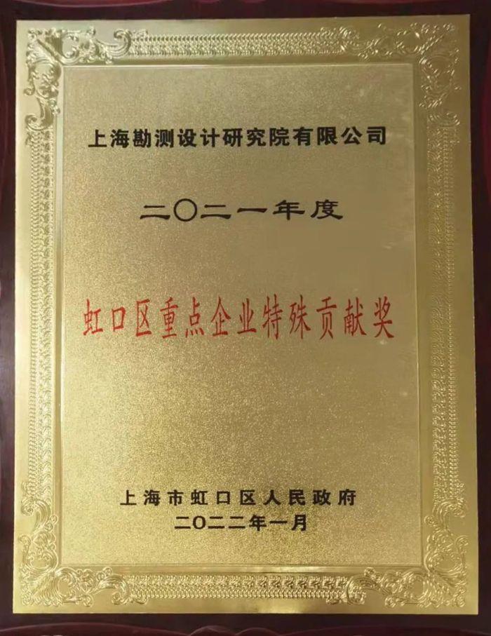 近日,在上海市虹口区2022年重点企业及重点楼宇(园区)表彰会上,三峡上海院再次荣获“2021年度虹口区特殊贡献重点企业”称号。