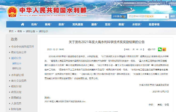 12月22日,2021年度大禹水利科学技术奖(以下简称大禹奖)奖励结果公布,三峡上海院作为主要参与单位完成的“长三角地区水安全保障技术研究与应用”成果荣获科技进步特等奖。其中,课题组提出太湖流域综合治理的做法成效及政策建议被国资委单篇采...