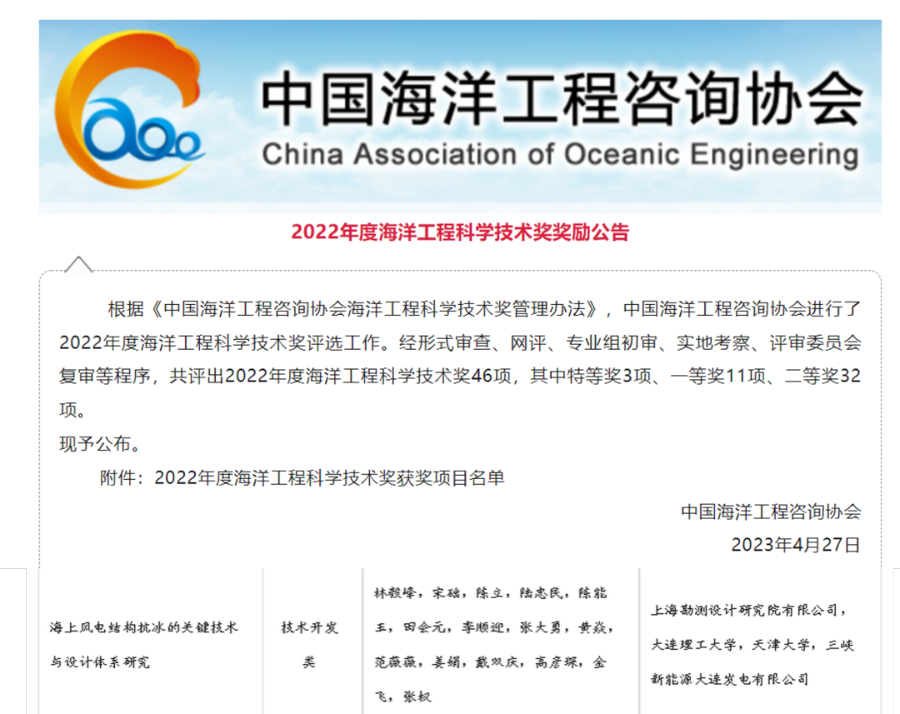 近日,在中国海洋工程咨询协会公布的2022年度海洋工程科学技术奖获奖项目名单中,由三峡上海院牵头,大连理工大学、天津大学、三峡新能源大连发电有限公司共同完成的《海上风电结构抗冰的关键技术与设计体系研究》荣获海洋工程科学技术奖一等奖。