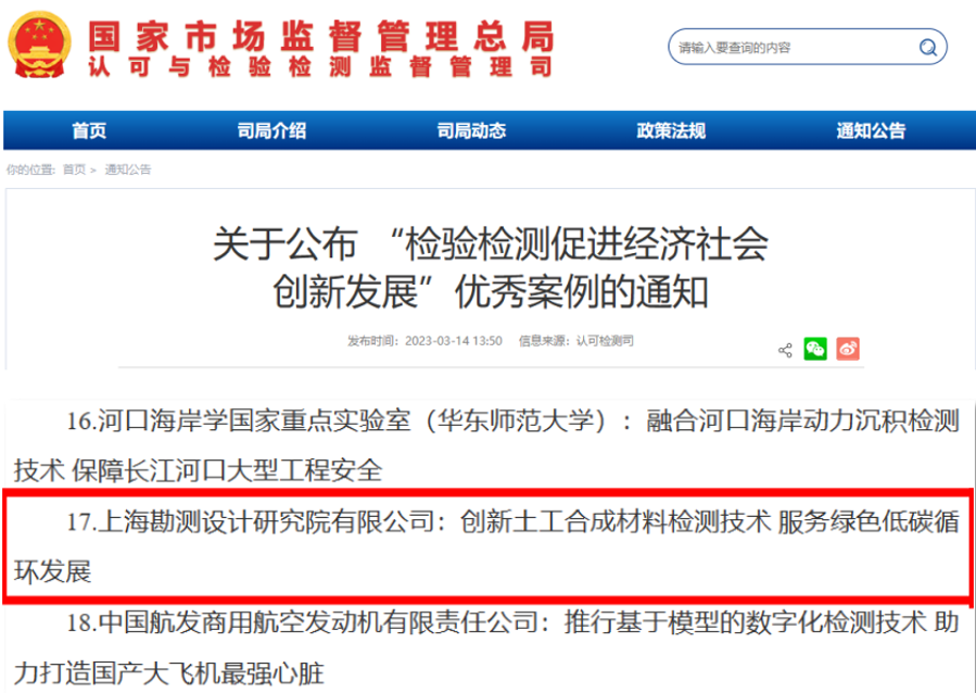 3月14日,国家市场监督管理总局发布了《关于公布“检验检测促进经济社会创新发展”优秀案例的通知》,由三峡上海院组织申报的“创新土工合成材料检测技术 服务绿色低碳循环发展”获评国家市场监督管理总局2022年“检验检测促进经济社会创新发展”...