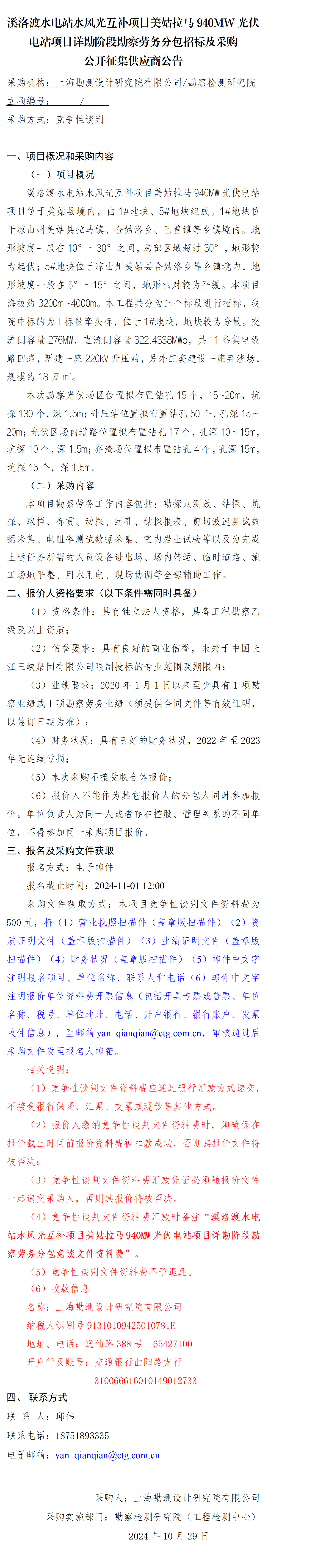 溪洛渡水电站水风光互补项目美姑拉马940MW光伏电站项目详勘阶段勘察劳务分包招标及采购 公开征集供应商公告