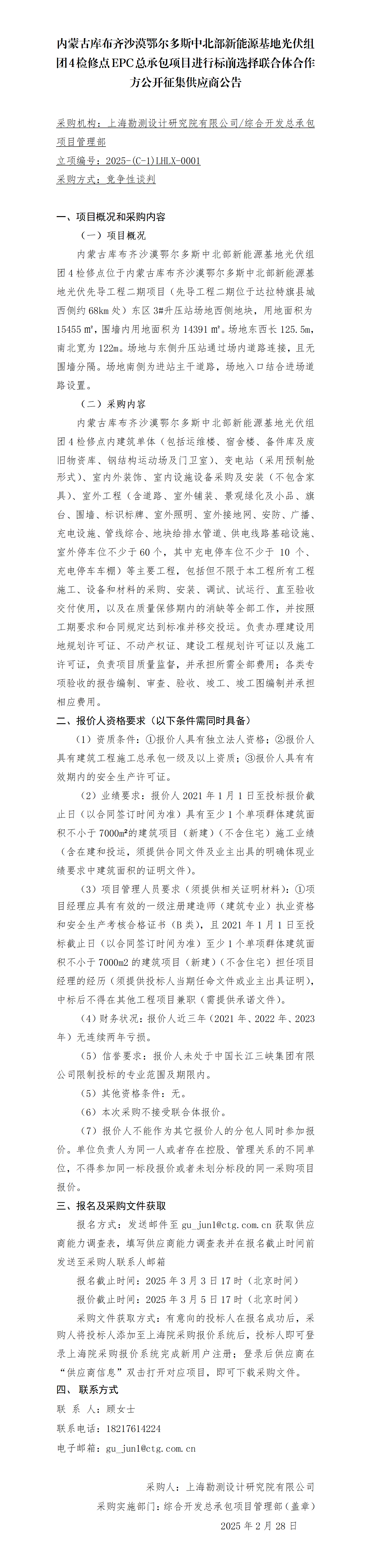 内蒙古库布齐沙漠鄂尔多斯中北部新能源基地光伏组团4检修点EPC总承包项目进行标前选择联合体合作方公开征集供应商公告