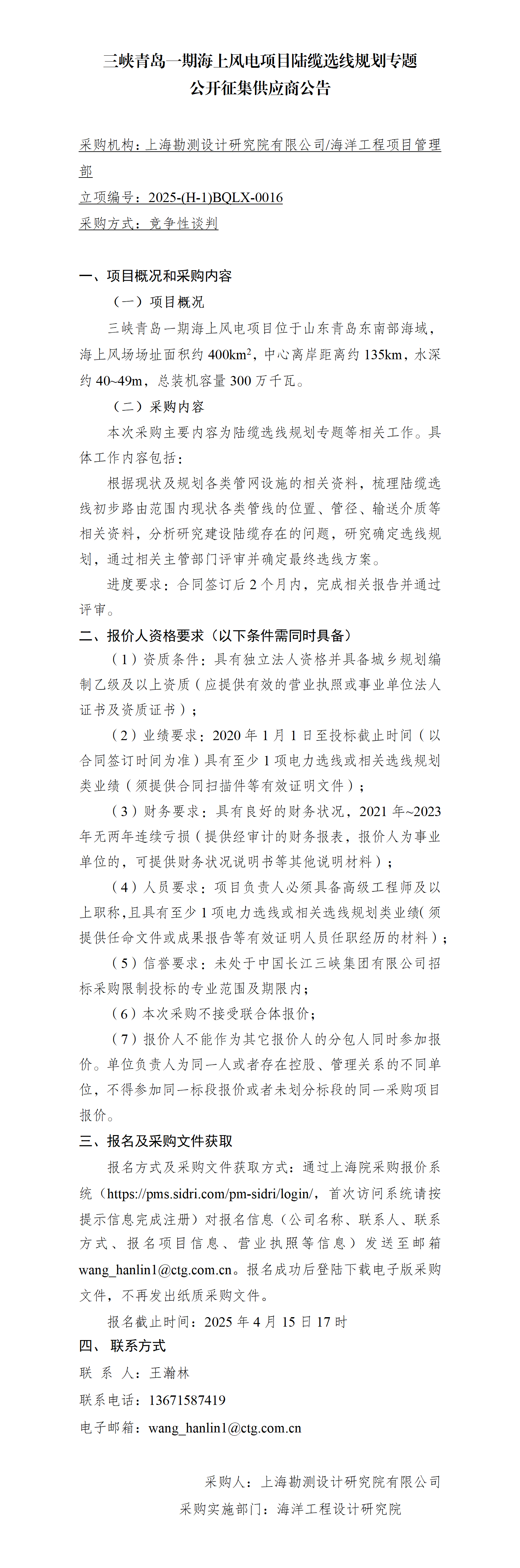 三峡青岛一期海上风电项目陆缆选线规划专题 公开征集供应商公告