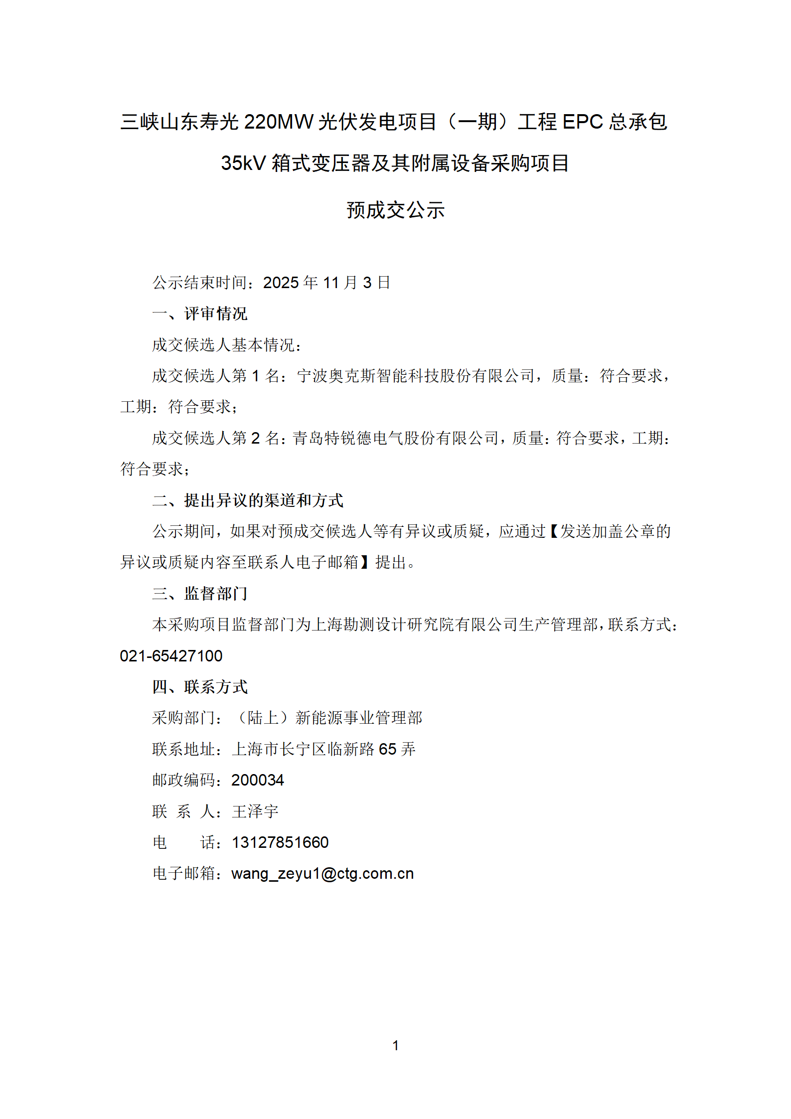 三峡山东寿光220MW光伏发电项目(一期)工程EPC总承包35kV箱式变压器及其附属设备采购项目预成交公示