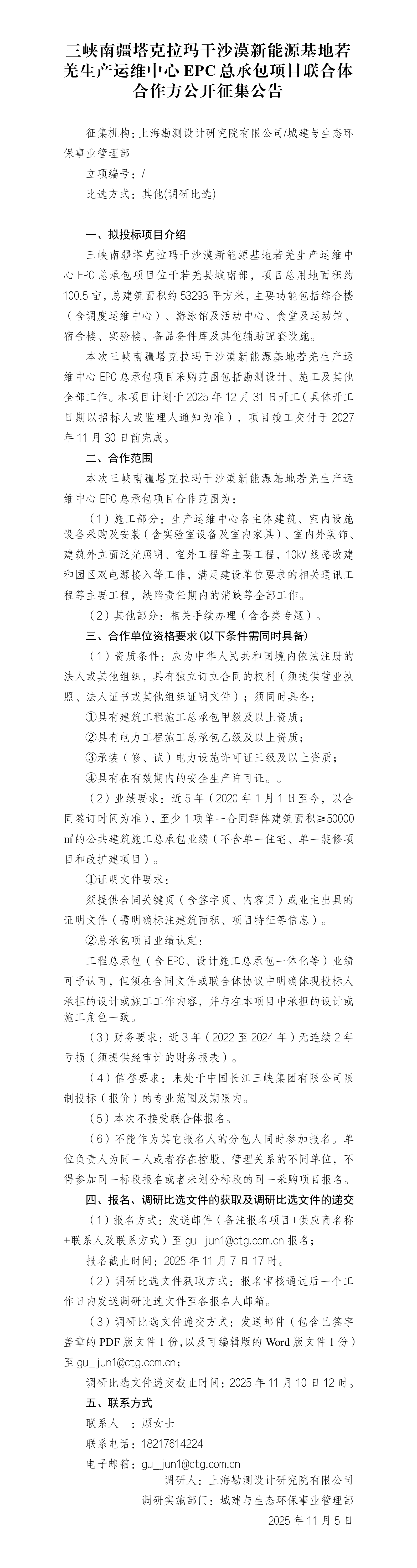 三峡南疆塔克拉玛干沙漠新能源基地若羌生产运维中心EPC总承包项目联合体合作方公开征集公告