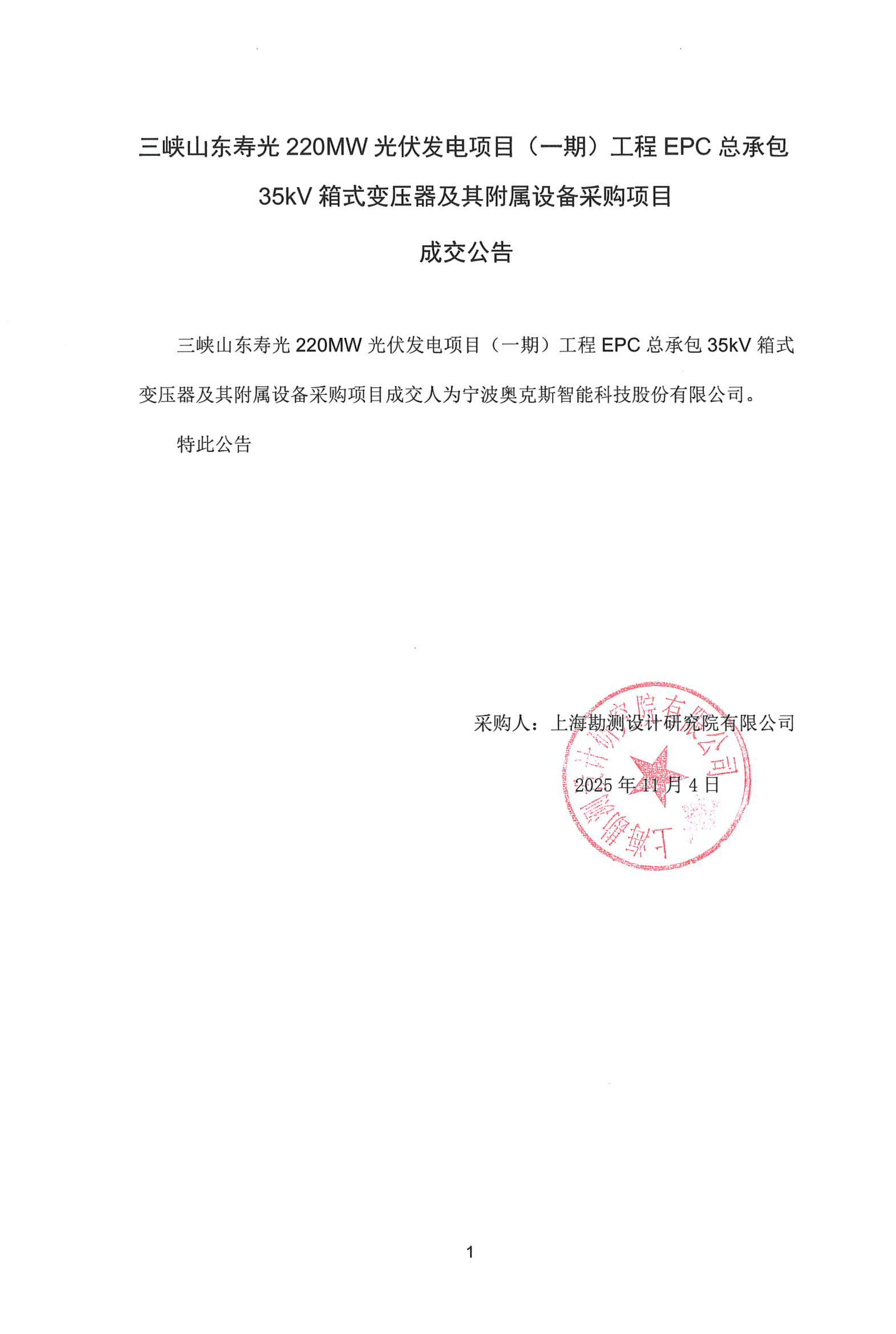 三峡山东寿光220MW光伏发电项目(一期)工程EPC总承包35kV箱式变压器及其附属设备采购项目成交公告