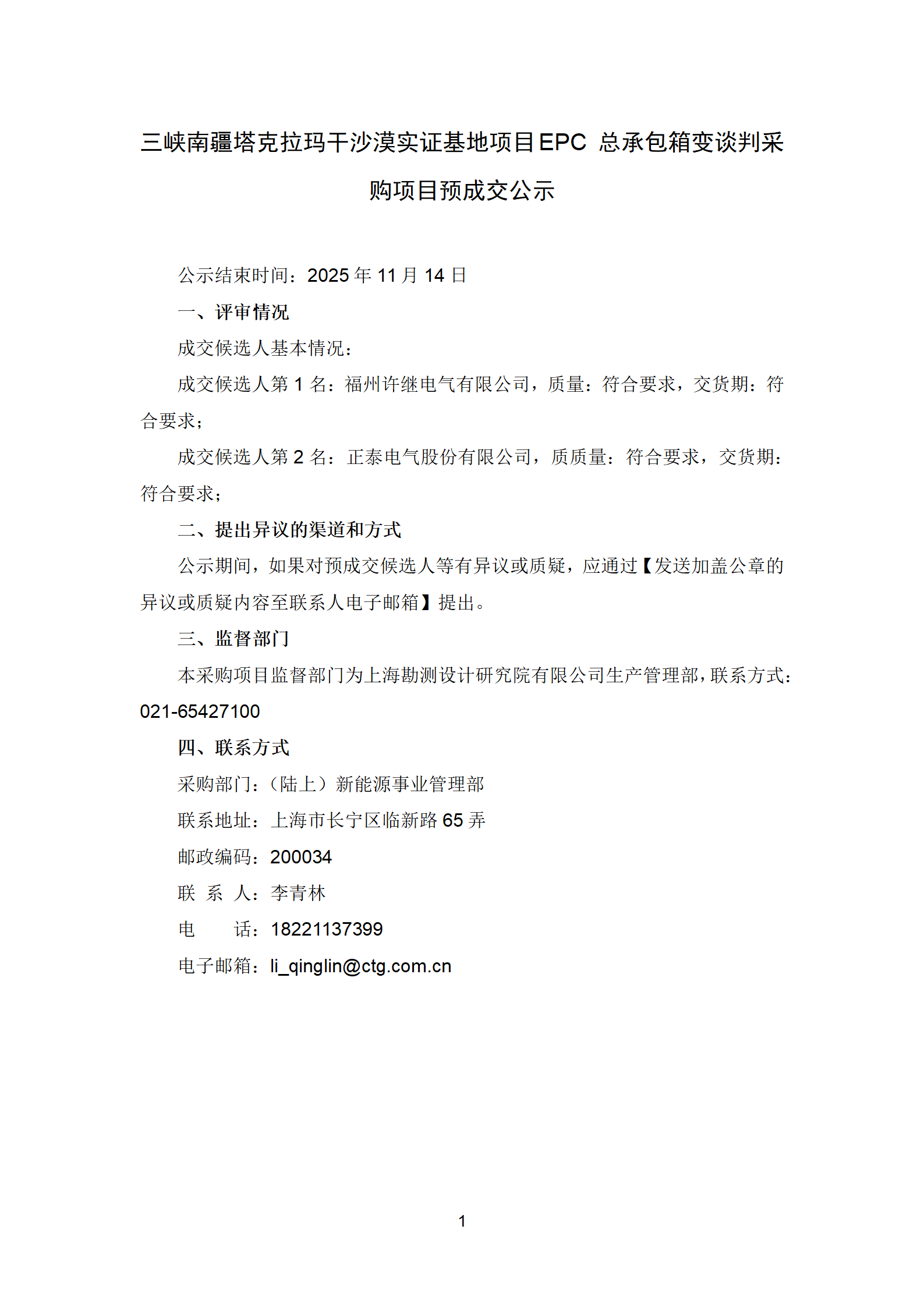三峡南疆塔克拉玛干沙漠实证基地项目EPC 总承包箱变谈判采购项目预成交公示