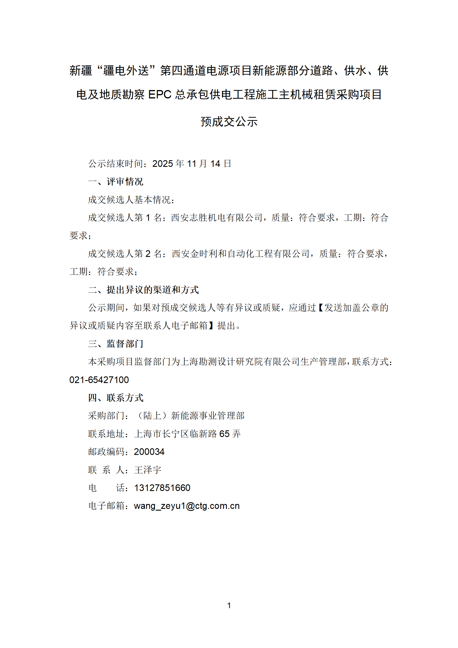 新疆“疆电外送”第四通道电源项目新能源部分道路、供水、供电及地质勘察EPC总承包供电工程施工主机械租赁采购项目预成交公示
