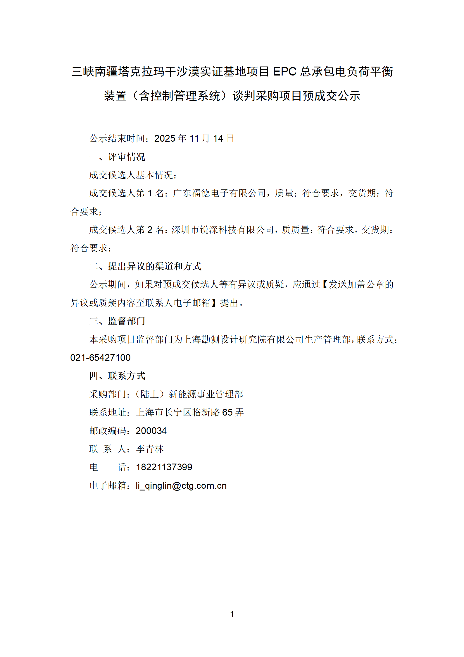 三峡南疆塔克拉玛干沙漠实证基地项目EPC总承包电负荷平衡装置(含控制管理系统)谈判采购项目预成交公示