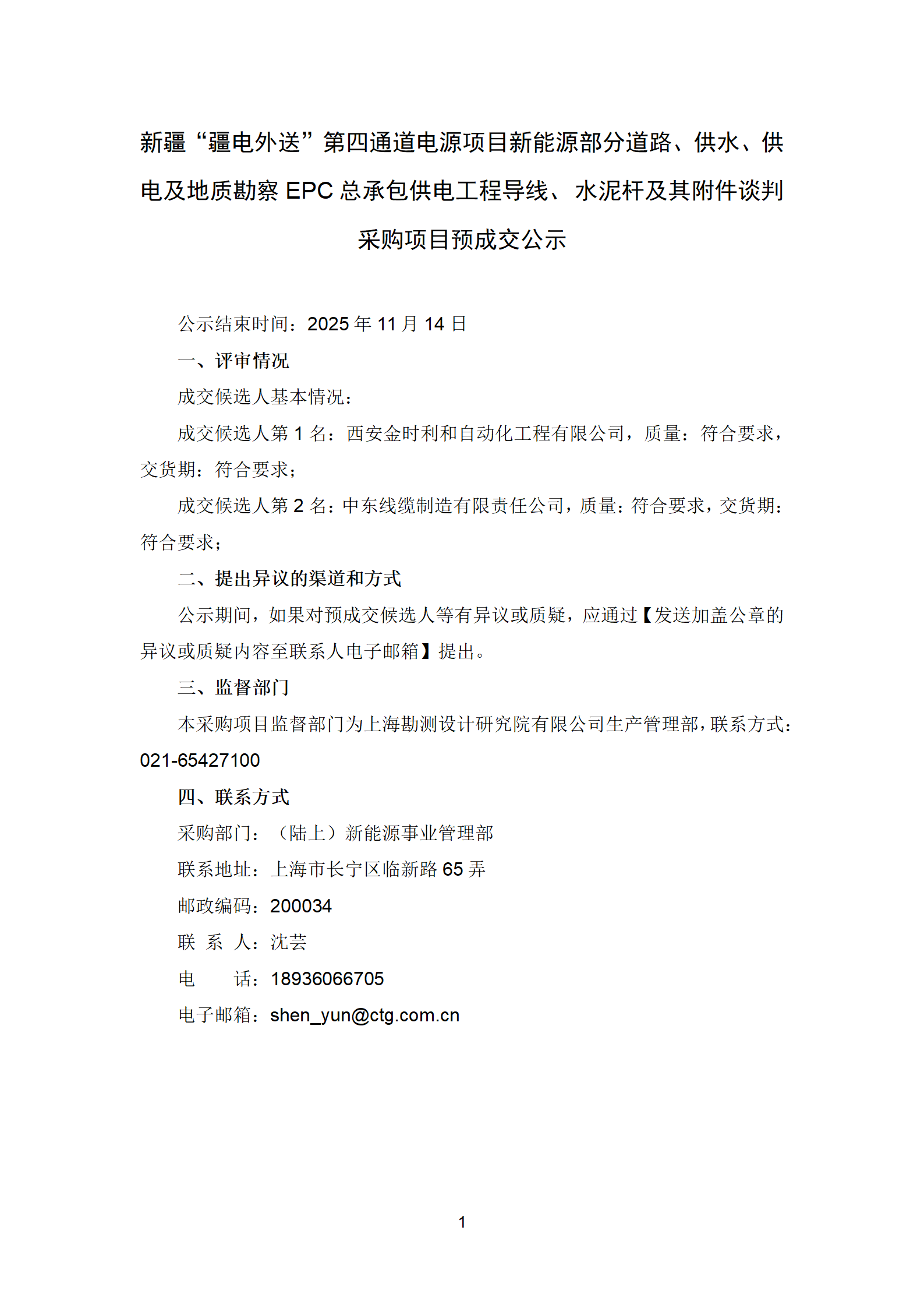 新疆“疆电外送”第四通道电源项目新能源部分道路、供水、供电及地质勘察EPC总承包供电工程导线、 水泥杆及其附件谈判采购项目预成交公示