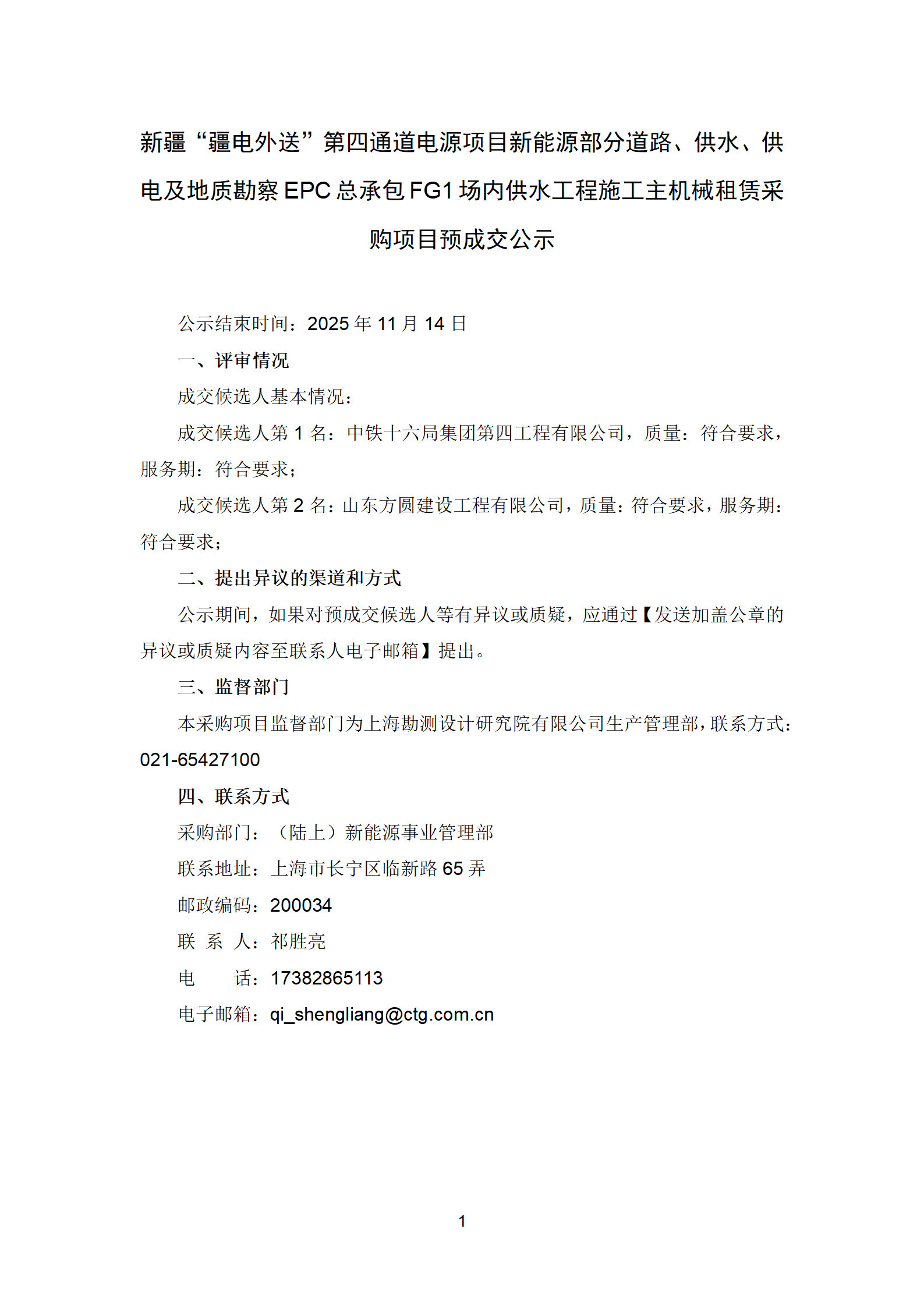 新疆“疆电外送”第四通道电源项目新能源部分道路、供水、供电及地质勘察EPC总承包FG1场内供水工程施工主机械租赁采购项目预成交公示