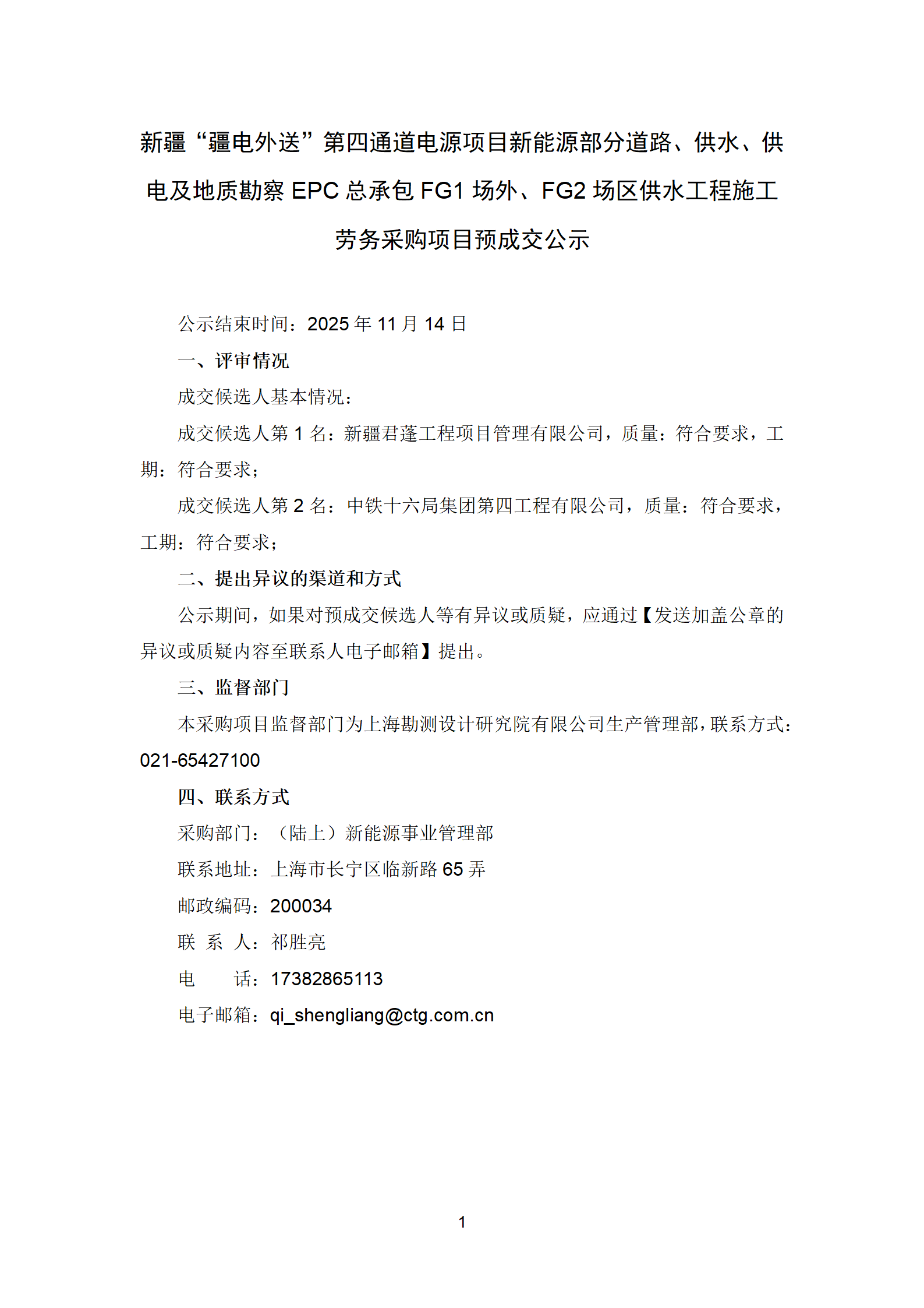 新疆“疆电外送”第四通道电源项目新能源部分道路、供水、供电及地质勘察EPC总承包FG1场外、FG2场区供水工程施工劳务采购项目预成交公示