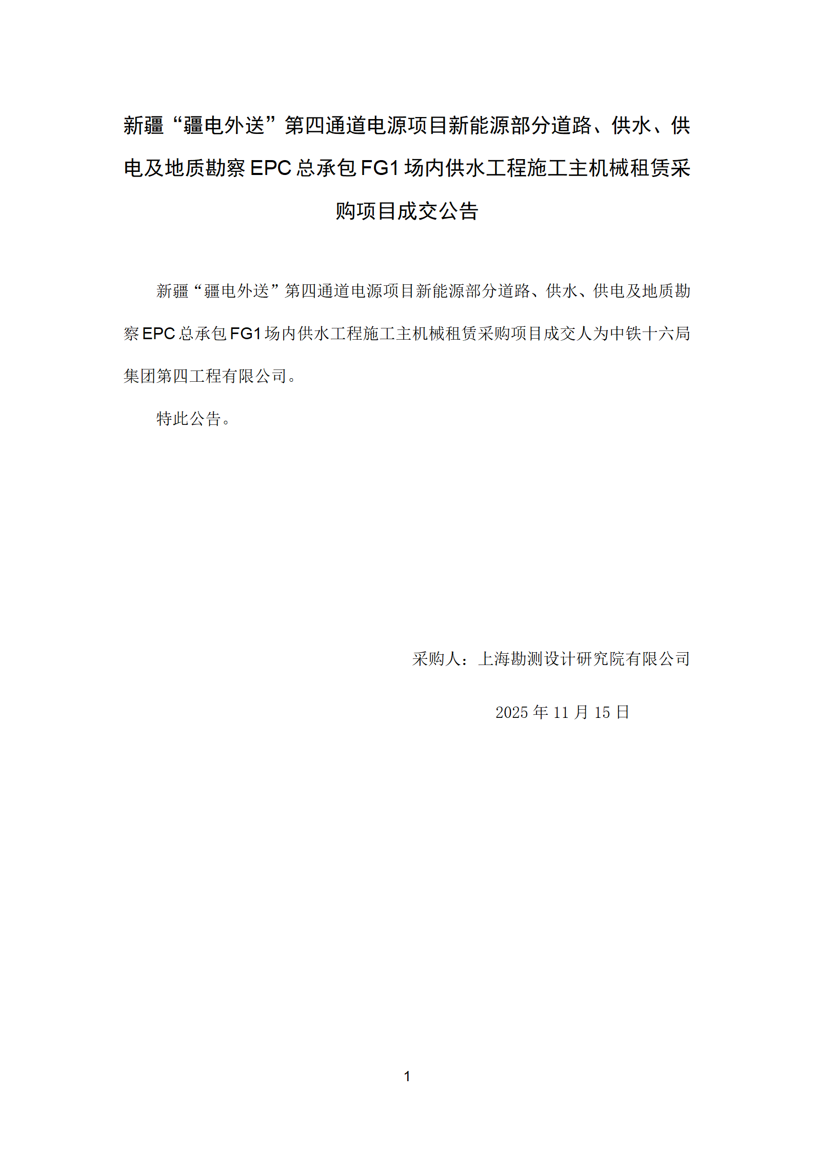 新疆“疆电外送”第四通道电源项目新能源部分道路、供水、供电及地质勘察EPC总承包FG1场内供水工程施工主机械租赁采购项目成交公告