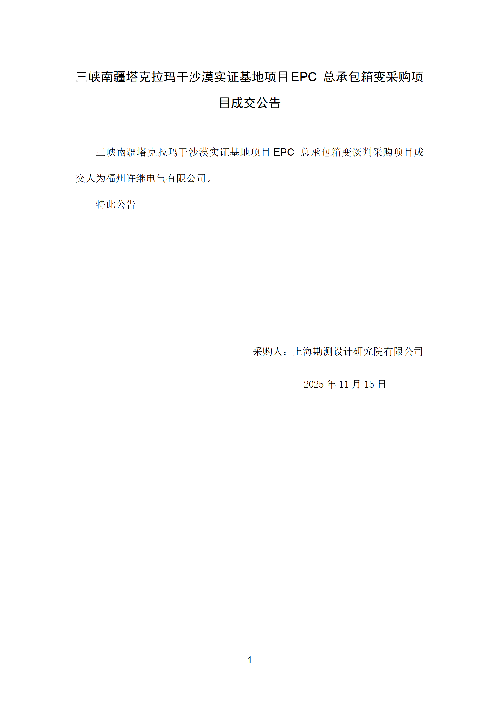 三峡南疆塔克拉玛干沙漠实证基地项目EPC 总承包箱变采购项目成交公告