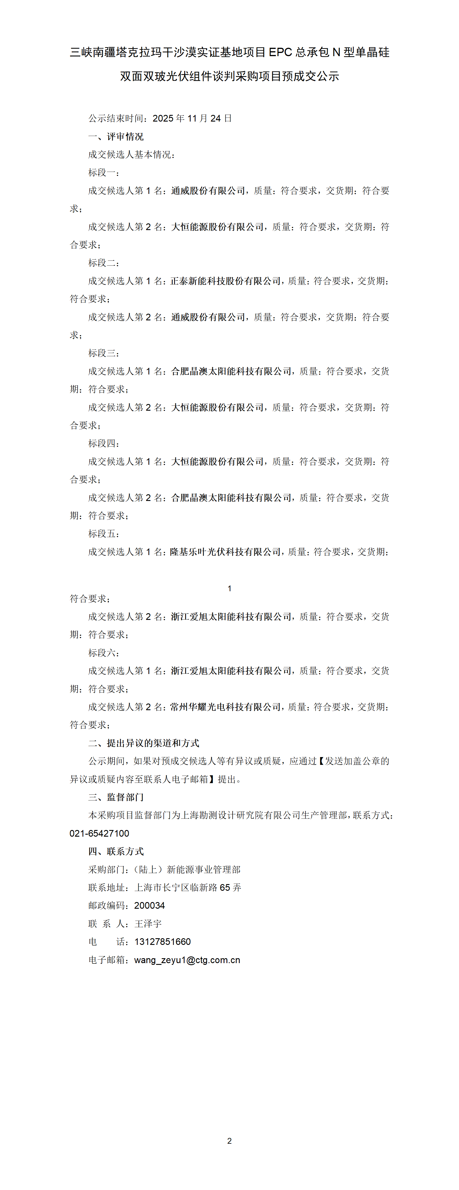 三峡南疆塔克拉玛干沙漠实证基地项目EPC总承包N型单晶硅双面双玻光伏组件谈判采购项目预成交公示