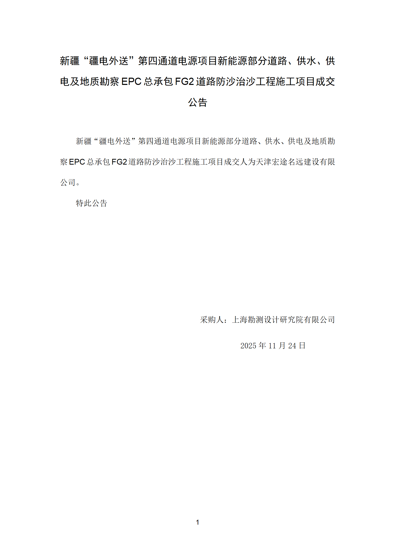 新疆“疆电外送”第四通道电源项目新能源部分道路、供水、供电及地质勘察EPC总承包FG2道路防沙治沙工程施工项目成交公告