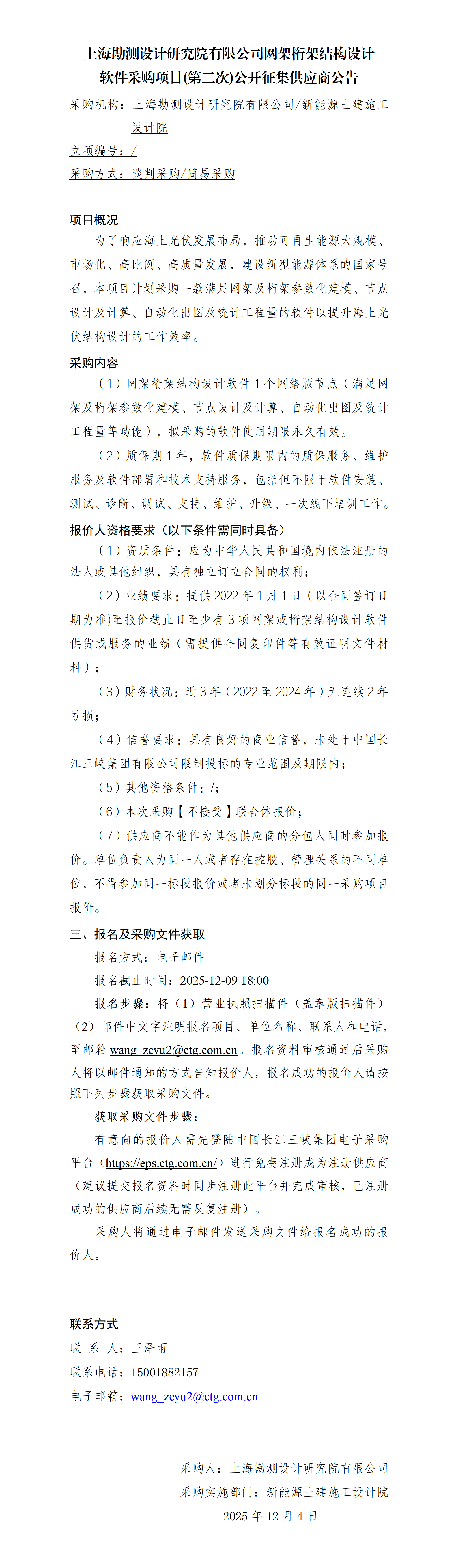 上海勘测设计研究院有限公司网架桁架结构设计 软件采购项目公开征集供应商公告