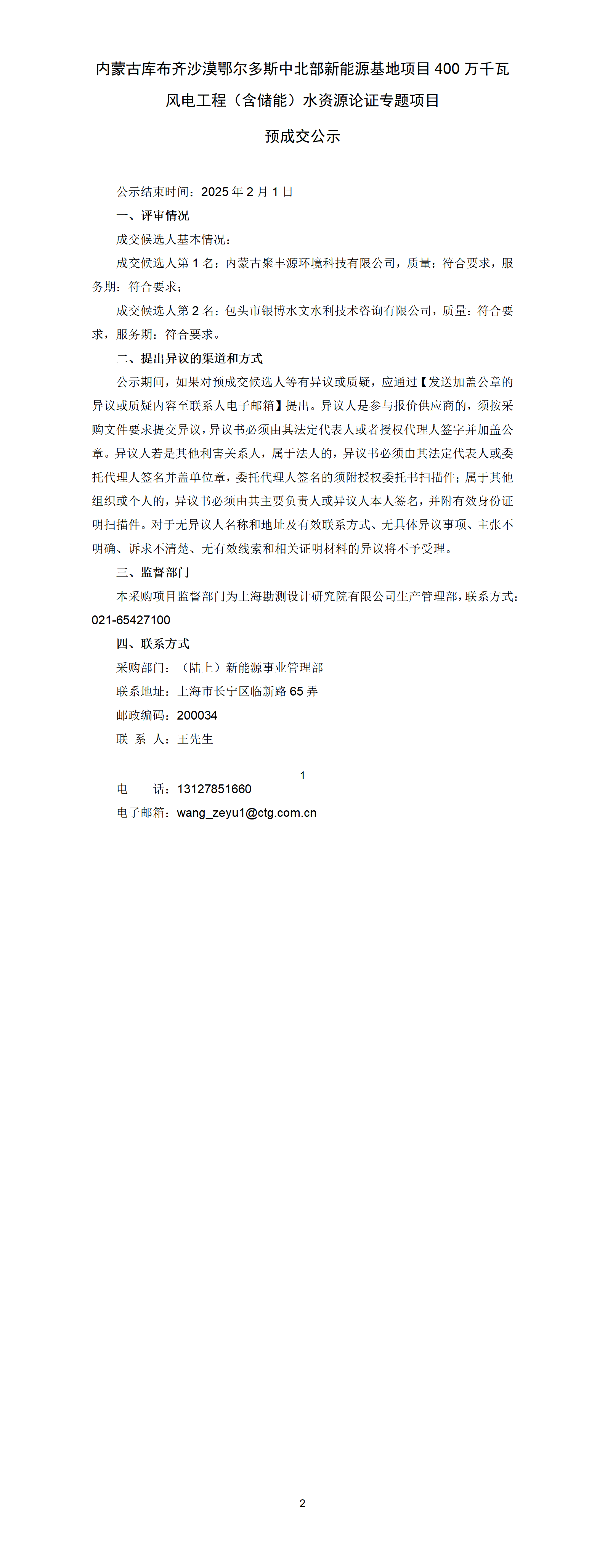 内蒙古库布齐沙漠鄂尔多斯中北部新能源基地项目400万千瓦风电工程(含储能)水资源论证专题项目预成交公示