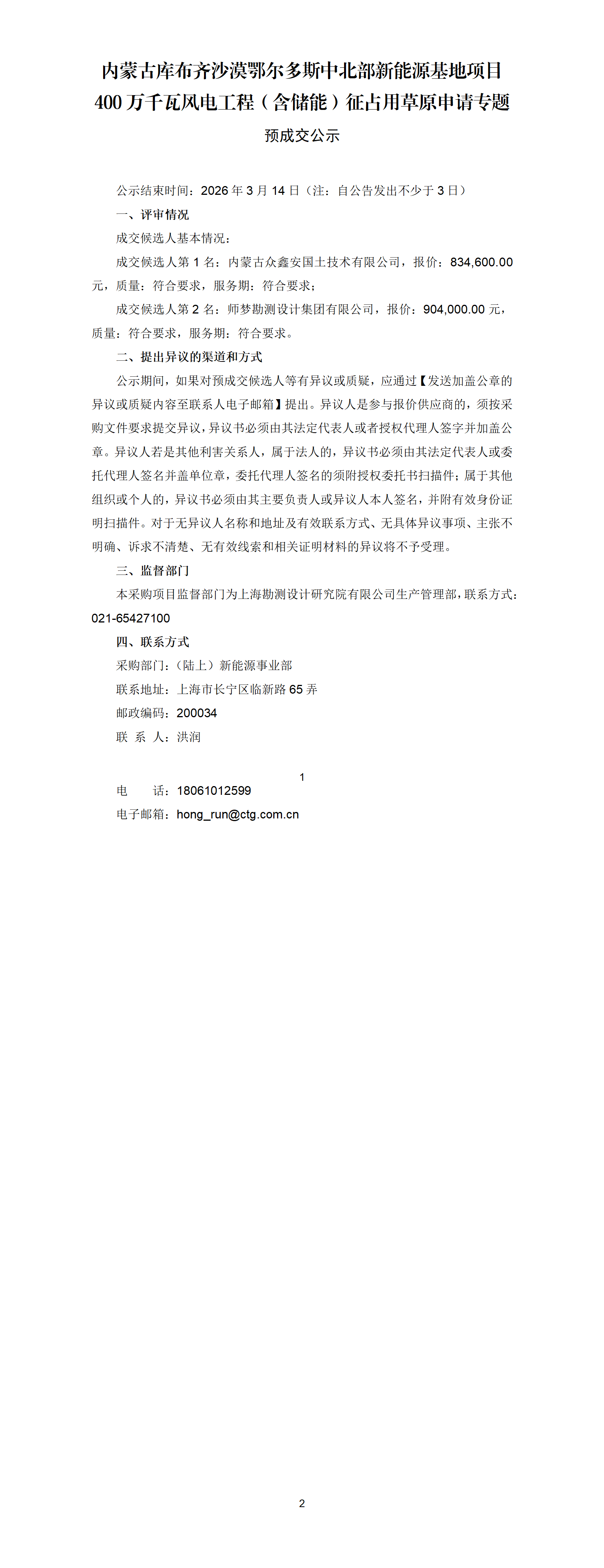 内蒙古库布齐沙漠鄂尔多斯中北部新能源基地项目400万千瓦风电工程(含储能)征占用草原申请专题预成交公示
