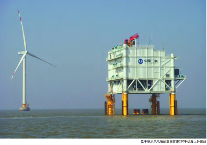 由于海上升压站比较复杂,总重量很大,一般采用在陆地上整体建造,再由工程船运到海上一体化安装的操作模式。以响水海上风电场的海上升压站为例,上部平台分4层,主体平面尺寸约25米×28位于响水风电场的亚洲首座220千伏海上升压站米,高约25米,总重约2000吨。