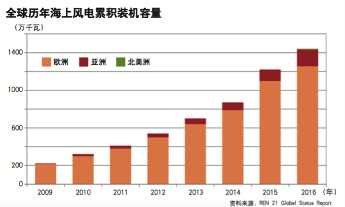 自1991年全球第一座海上风电场在丹麦开始运行以来,海上风电发展已经走过了二十余年。早期海上风电发展速度缓慢,2008年以后,随着风电技术的进步以及投资者对海上风能资源认识的不断加深,已经有多个国家将海上风电作为未来风电发展的主要方向海上风电保持了持续增长的良好势头。