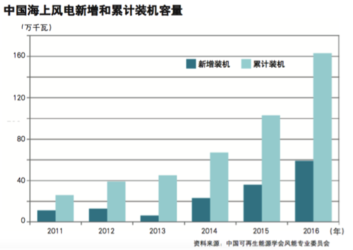 自2010年首个海上风电并网项目上海东海大桥海上风电场建成投产以来,在此后的3年里,江苏如东3万千瓦和15万千瓦潮间带试验、示范风电场及其扩建工程陆续建成。2012年底,我国海上风电累计装机接近40万千瓦;受各种因素影响,2013年海上风电发展显著减缓;自2014年以来,我国海上风电装机迅速增加,当年新增并网容量约20万千瓦,全部位于江苏省;2015年新增装机容量为36万千瓦,主要分布在江苏省和福建省;2016年新增装机154台,容量达到59万千瓦。截至2016年底,我国已建成海上风电累计装机容量162万千瓦,在全球仅次于英国与德国。我国海上风电占全国风电总装机容量的比重由2011年的0.42%上升至2016年的0.96%。