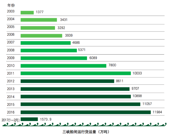 三峡工程是治理和开发长江的关键性骨干工程,对推动长江经济带发展具有重要意义。三峡工程蓄水后,极大地促进了长江航运的快速发展和沿江经济社会的协调发展,使长江“黄金水道”实至名归,有力地支持了长江经济带战略的实施。目前,三峡船闸全年过闸货运量是三峡工程蓄水前该河段年最高货运量的6倍以上。