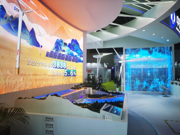 展厅布置采用“两翼齐飞”造型,以蓝、白色为主色调,使用声、光、电相结合的方式,打造简洁、明快、新颖的视觉效果。展览采用三峡工程模型,配合LED大屏,真实再现世界最大水利枢纽工程在防洪、发电、航运、生态补水等方面的巨大综合效益。在电力生产场景中使用的智能巡检机器人、自主研发的可编程智能控制器等数字产品也在此次展会上亮相。与会嘉宾给予三峡集团展厅“最精致、最用心、最大气”的高度评价。