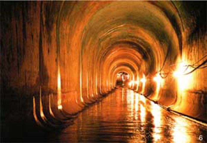 假如船舶要从下游驶向上游——船舶驶入第五闸室后,关闭下游人字门,通过地下输水系统,第四闸室往第五闸室内充水,当两个闸室内水面齐平时,打开上游人字门,船舶驶入第四闸室。依此类推,船舶就好像爬过一级又一级楼梯一样,通过第一闸室,驶向大坝上游航道。船舶下行的过程相反。三峡船闸单个闸室净宽34米、长280米,是世界上最大的闸室,可同时容纳6艘3000吨级船舶。一艘船通过三峡船闸大约要3个小时。