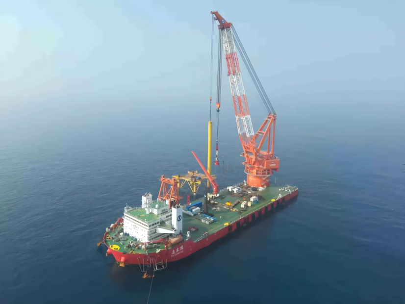 ▲ 起重船“电建志高”进行钢管桩沉桩